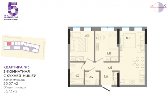 Комнаты 9,72 и 10,35 квм, Кухня-гостиная 19,11 квм, Санузел раздельный 4,37 и 2,72 квм, Ниша под одежду.